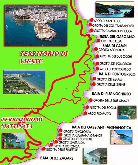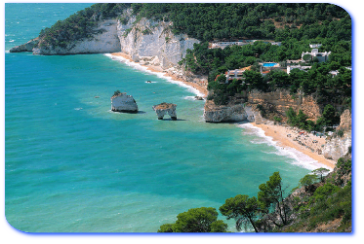 Da Vieste alla baia di Mattinata vi è una splendida visione del litorale garganico per l'inesauribile succedersi dei meravigliosi scenari naturali, di insenature e spiaggette al riparo di bianche pareti rocciose a strapiombo sul mare e di verdi macchie di pini che si specchiano nell'azzurro intenso delle acque limpide del mare.